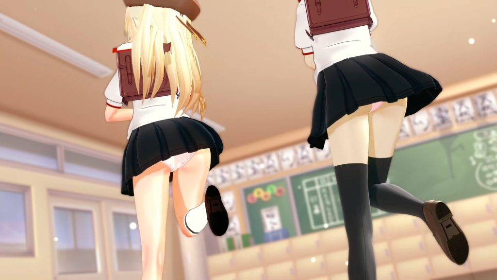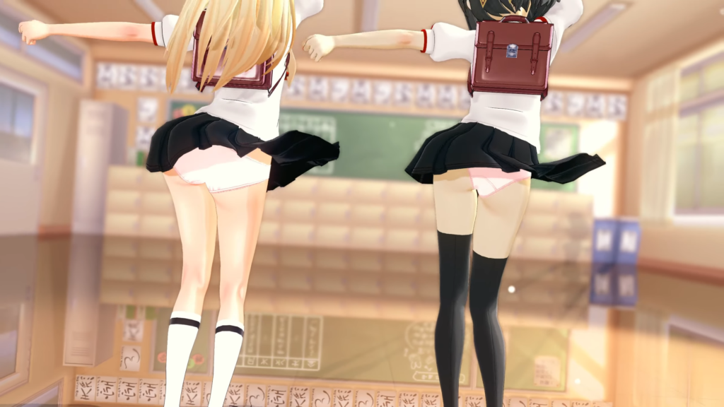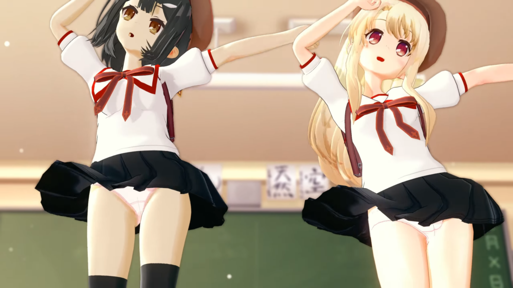 ふりふりミニスカートが最高です。パンチラいっぱい。ローアングルもいっぱいです。おパンツの食い込み方が二人で違うのがポイント高いと思います…。
