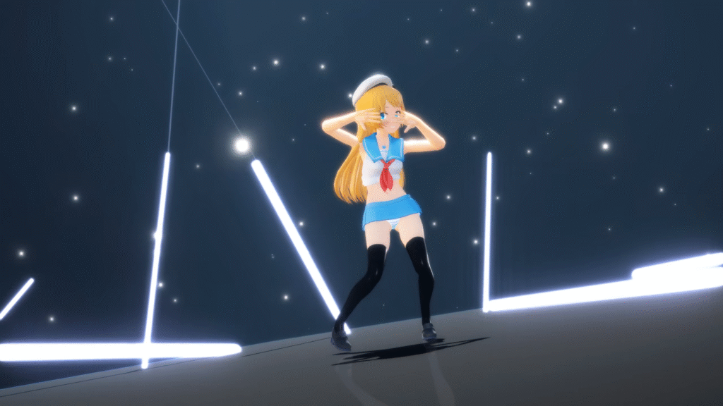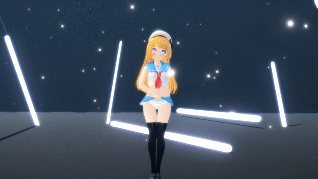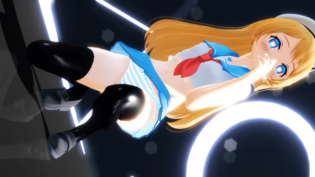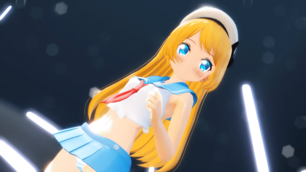 お肌の露出が多すぎてえっちすぎる…。太もも、おへそ、脇(ワキ)が丸見え…。ハート目もかわいい。たくし上げおパンツ見せもあります。