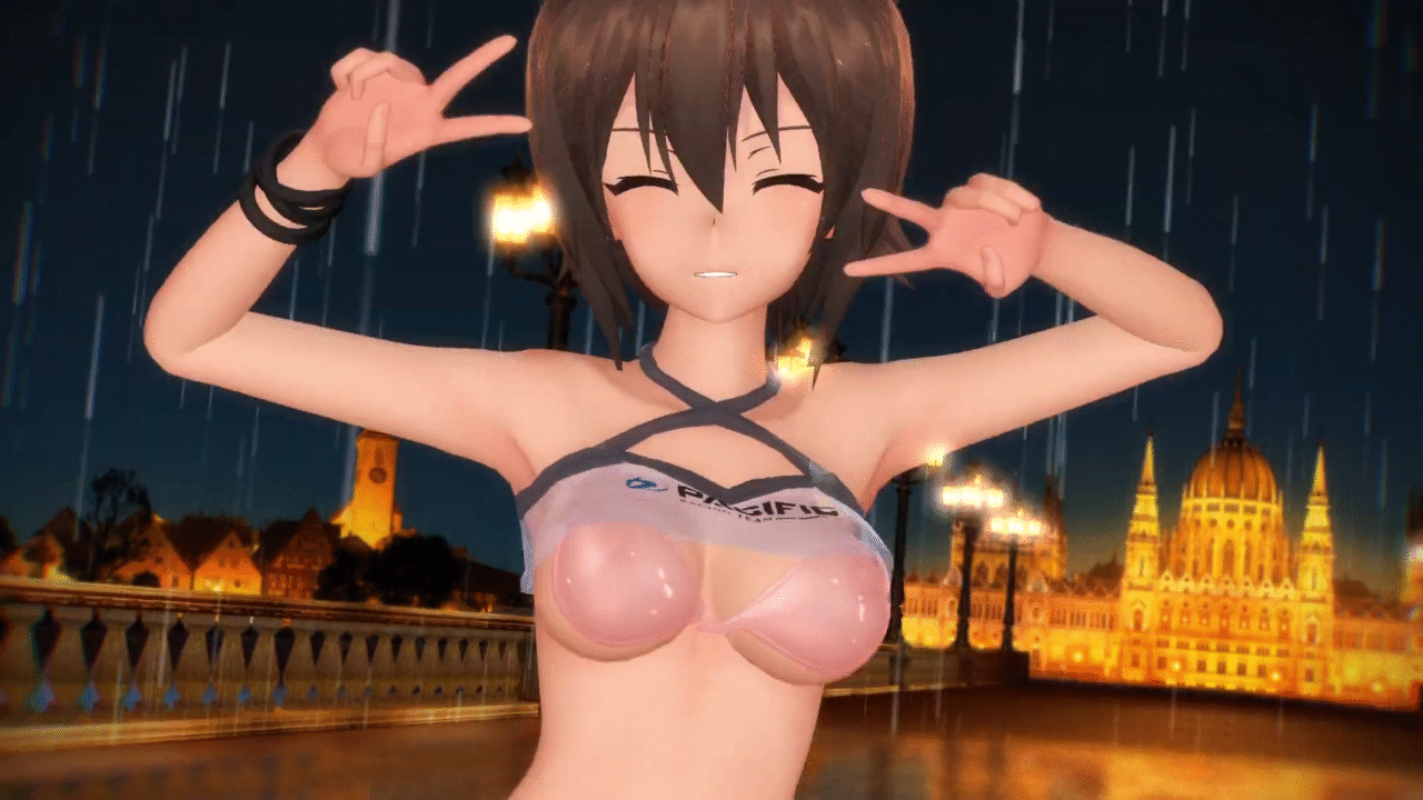 雨の中踊っていますね。どんどん衣装が薄くなってます…。よく見ると透けているような。チラリズム、下着、マイクロビキニとえっちな衣装が盛りだくさん。